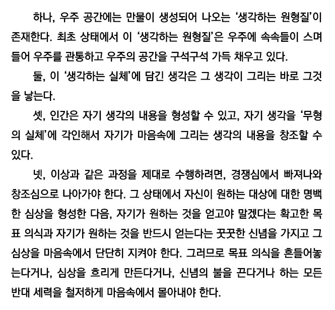 이 책은 일반인(평범한 직장인이나 회사원 혹은 주부 등)에게는 결코 추천하고 싶지 않습니다. 다만 자신이 고위직으로 진급을 해야하는 혹은 그렇게 하고 싶은 직장인이나 사업체의 CEO 혹은 정치인이라면 이 책을 꼭 읽어보라고 권해 드리고 싶습니다. 이책이야말로 바로 '시크릿'이라는 책의 원조격이라고 할 수 있습니다.