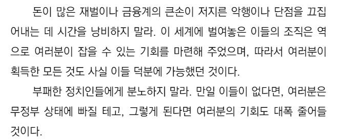 제가 책을 읽으면서 고개를 끄덕이면서 봤던 부분입니다. 그들의 틈바구니에서 기회를 잡기위해 노력해야 한다는 것은 틀림없는 사실이며 무정부상태가 되면 얼마나 큰 문제가 생기는지는 지금의 중동지역에 있는 많은 나라(예를 들면 이라크, 시리아 등)들을 보면서 알 수 있죠.