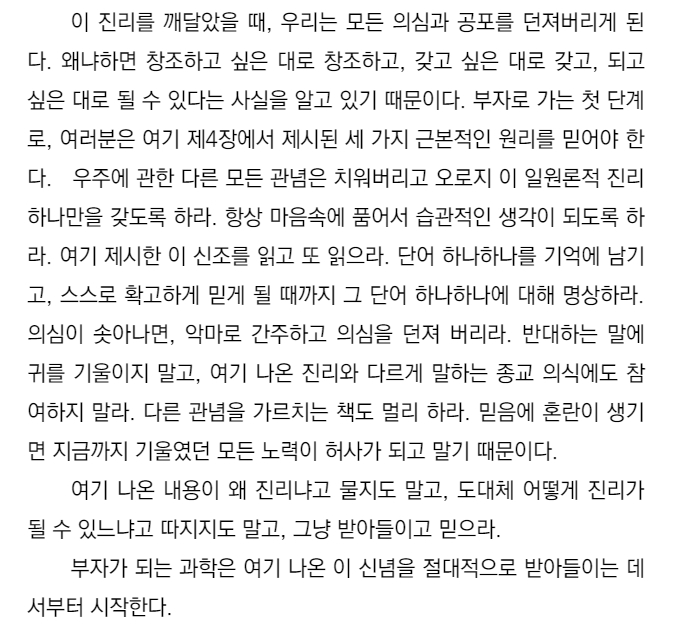 다시 한번 말씀 드리지만 이 책에는 그 어떤 과학적인 방법도 따라할 수 있는 예시도 들어있지 않습니다. 성공한 사람 그 누구의 실명도 들어있지 않으며 어떠한 이야기도 사실인지 확인 되지 않습니다. 하지만 저자의 이 성공을 하는 방법에 대한 신념은 본받을 만 한 거 같습니다. 다시 한번 말씀드리지만 정치인, 연예인(엔터테이너), CEO등의 사람들은 읽어보는 것을 추천드립니다. 그분들은 성공하는 방법을 알아야 하는 것이 아닌 성공할 수 있다는 확신이 필요한 분들이기 때문이죠.