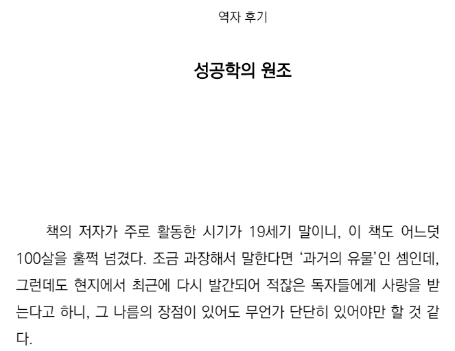 역자도 번역을 하며 말하고 있네요. 너무 오래되기도 했고 어거지를 부리는 책으로 보일 수도 있다고 이야기 합니다. 저로서는 장점보다는 단점이 더 많이 보이는 책이지만 그래도 한번 읽어보며 정신무장을 하시는 것도 나쁘지 않다고 생각합니다.