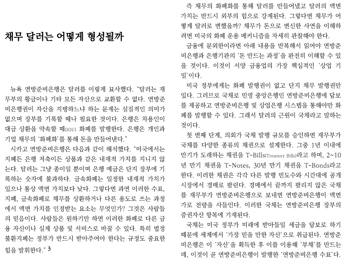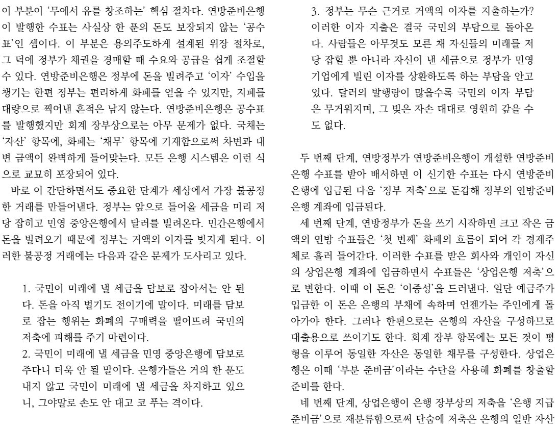 이 책에 나오는 이야기는 약간 황당하지만 그럴듯한 음모론입니다. 실제로 화폐가 어떻게 발행되고 만들어지는지에 대한 이야기를 보고 싶으시면 아래의 링크를 좀 읽어보시는 것도 좋으실 것 같습니다.