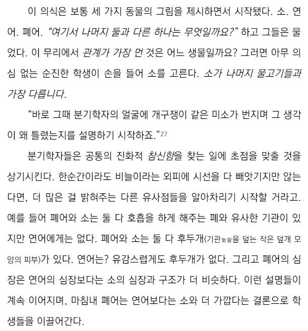 우리가 어류에 대해 해온 일이 바로 이와 똑같다. 수많은 미묘한 차이들을 “어류”라는 하나의 단어 아래 몰아넣은 것이다.